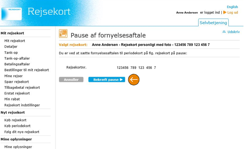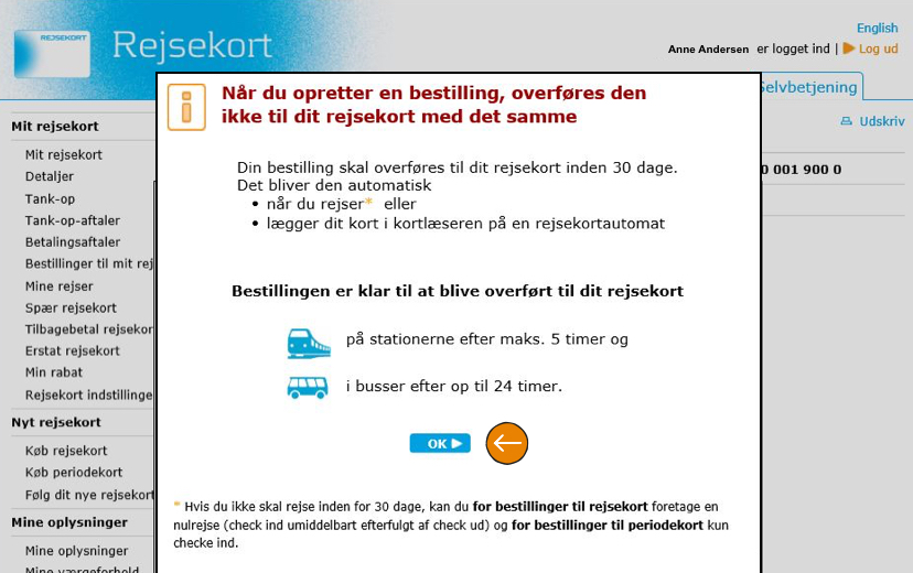 Pausen er bestilt, og du modtager en bekræftelse pr. mail. Overfør pausen til dit kort ved at checke ind eller lægge dit kort i kortlæseren på en Rejsekortautomat. Pausen skal overføres til dit kort inden for 30 dage, ellers bliver bestillingen annulleret.