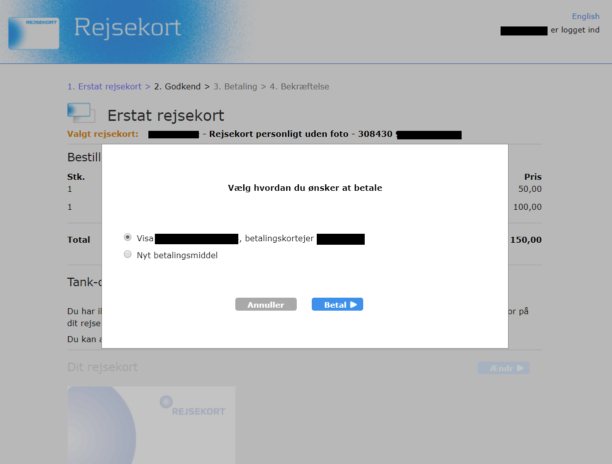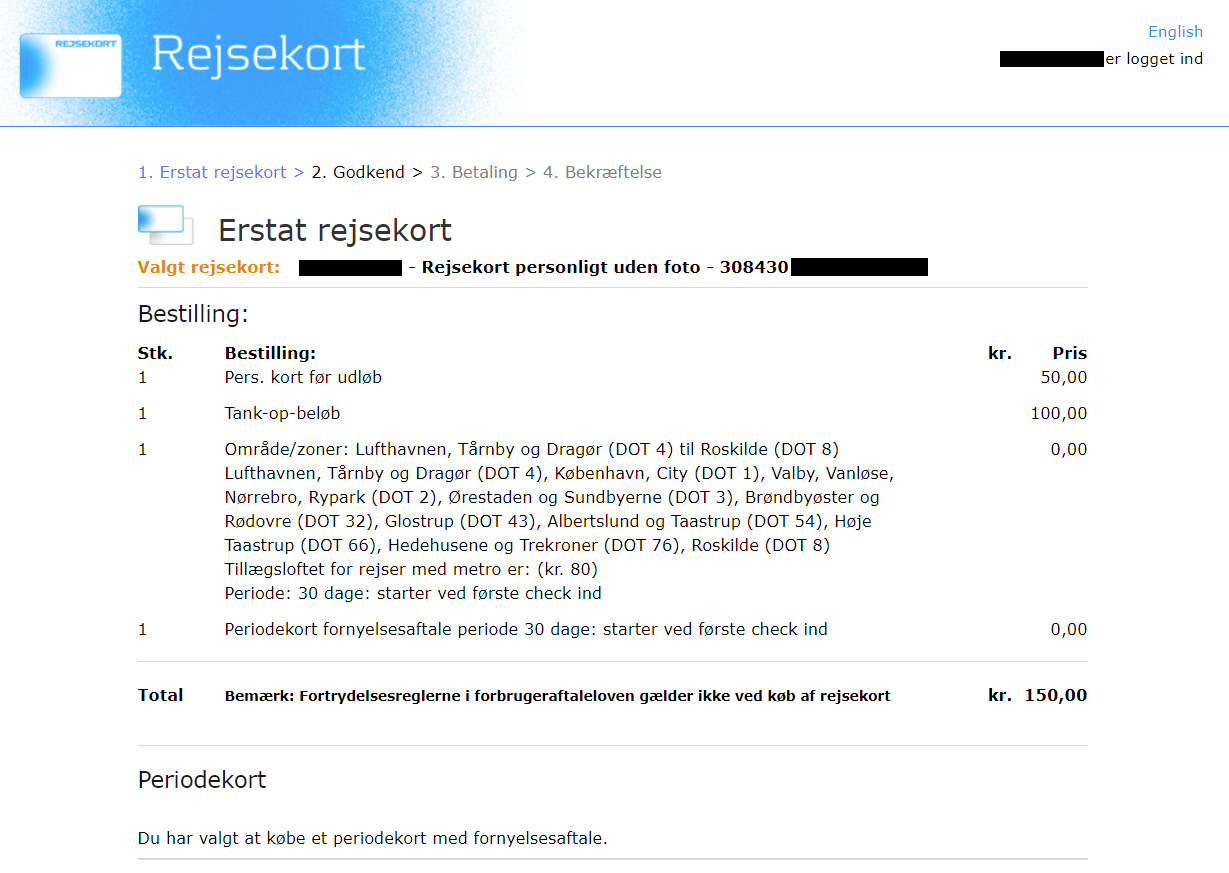 Når du har valgt det Rejsekort, du gerne vil erstatte, får du vist indstillingerne for det gældende Rejsekort - herunder zoner, tank-op aftale og prisen for at få dit kort erstattes. Hvis du er enig med betingelserne, skal du tilkendegive din accept.