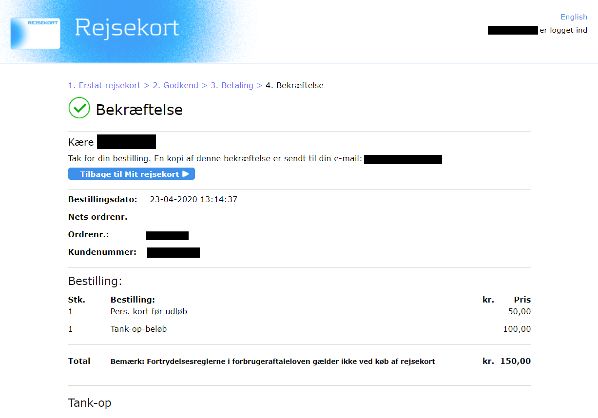 Når du har indtastet dine betalingsoplysninger, vil du modtage en bekræftelse på din bestilling.