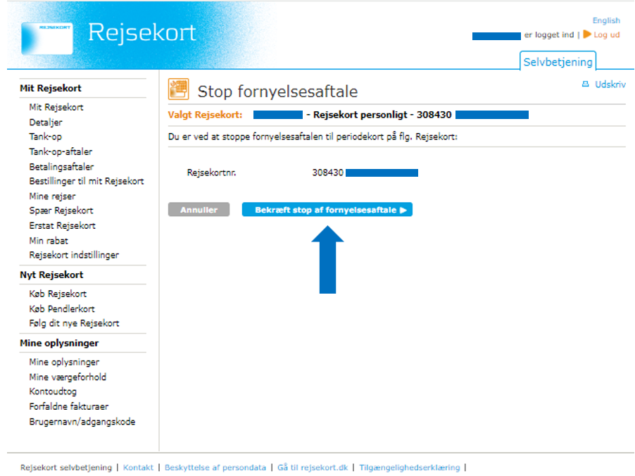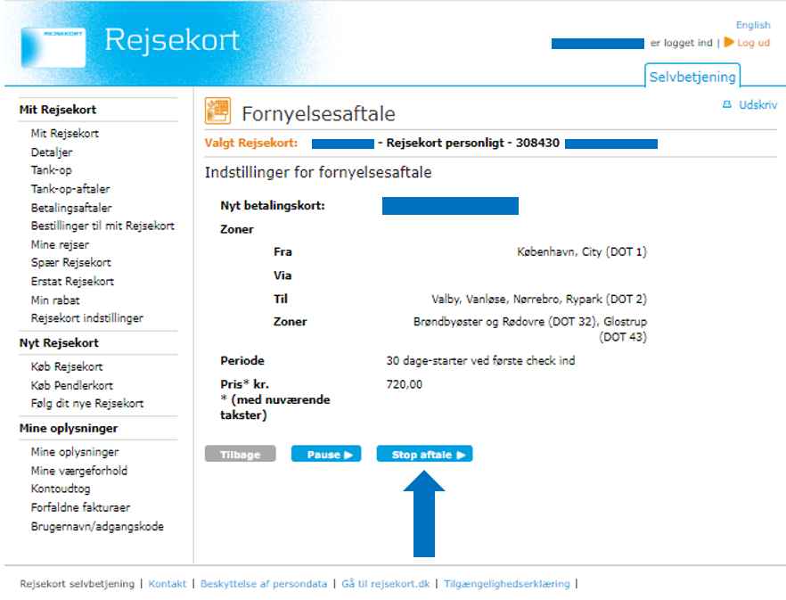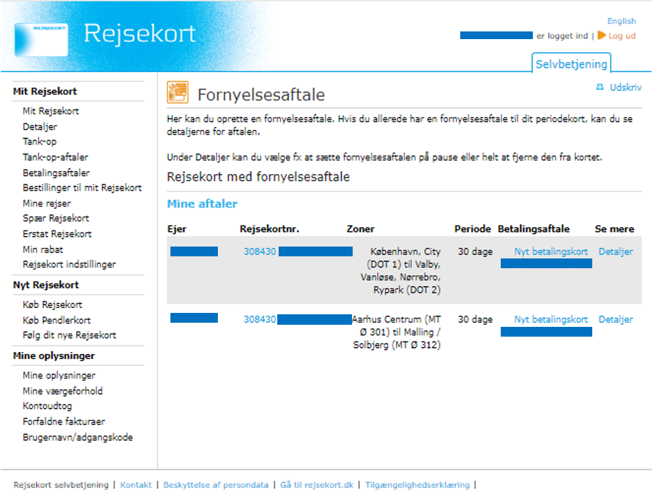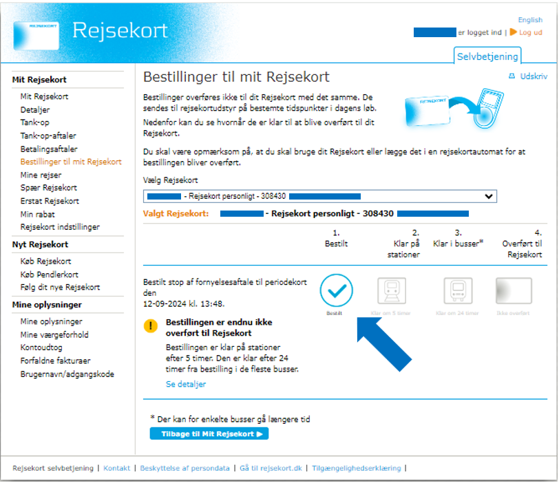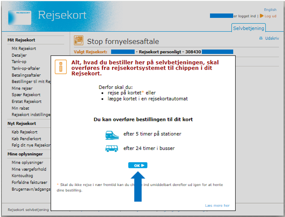 Please note that it can take up to 5 hours before the stop renewal agreement can be transferred to your Rejsekort from equipment at stations, and up to 24 hours before it can be transferred on bus journeys. You can see when the stop renewal agreement is ready to be transferred under ‘Order to my Rejsekort’.