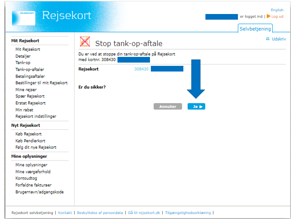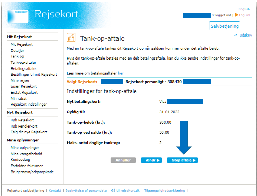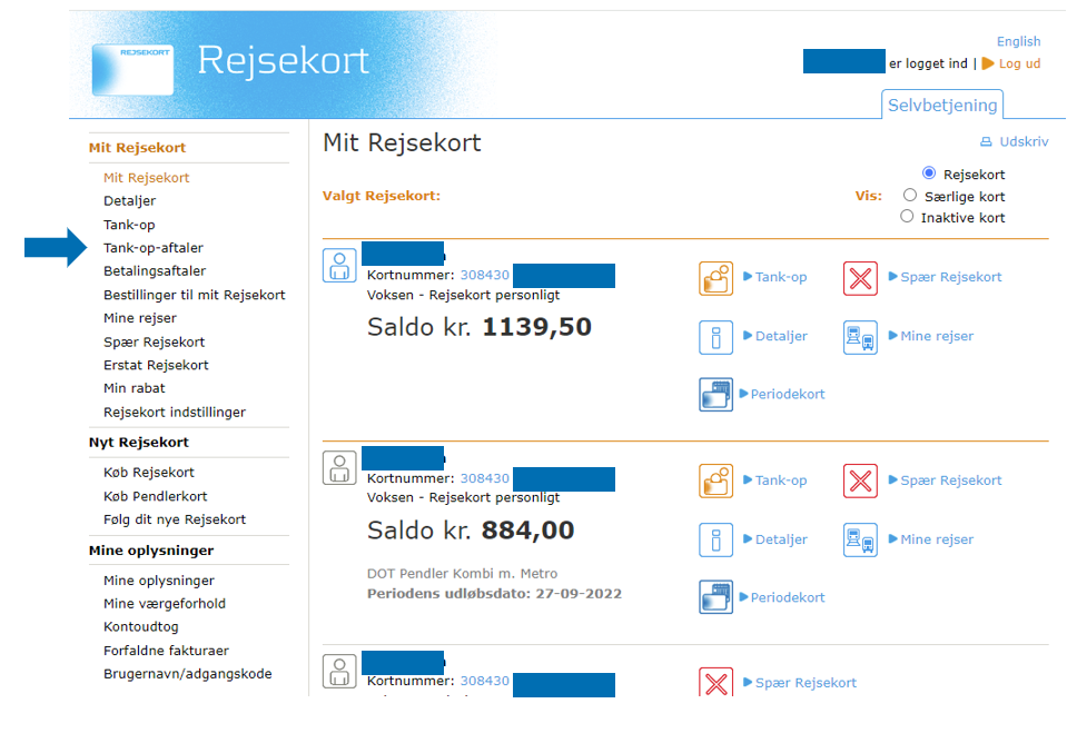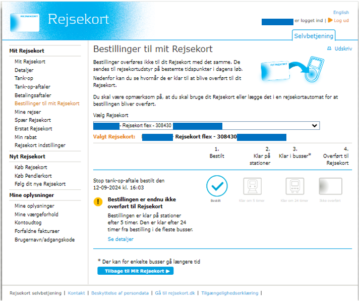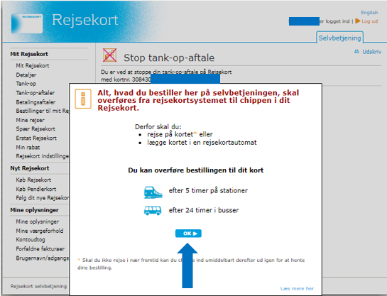 Please note that it can take up to 5 hours before the stop top-up agreement can be transferred to your Rejsekort from equipment at stations, and up to 24 hours before it can be transferred on bus journeys. You can see when the stop top-up agreement is ready to be transferred under ‘Order to my Rejsekort’.